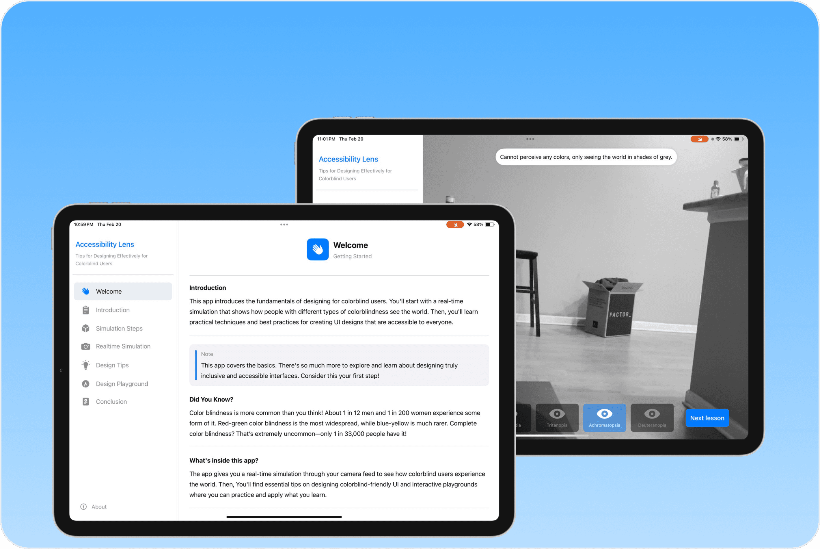 Accessibility Lens is an interactive Swift Playground that uses your device’s camera to simulate real-time color blindness. It helps designers actively explore and understand UI accessibility, turning abstract guidelines into clear, visual insights.