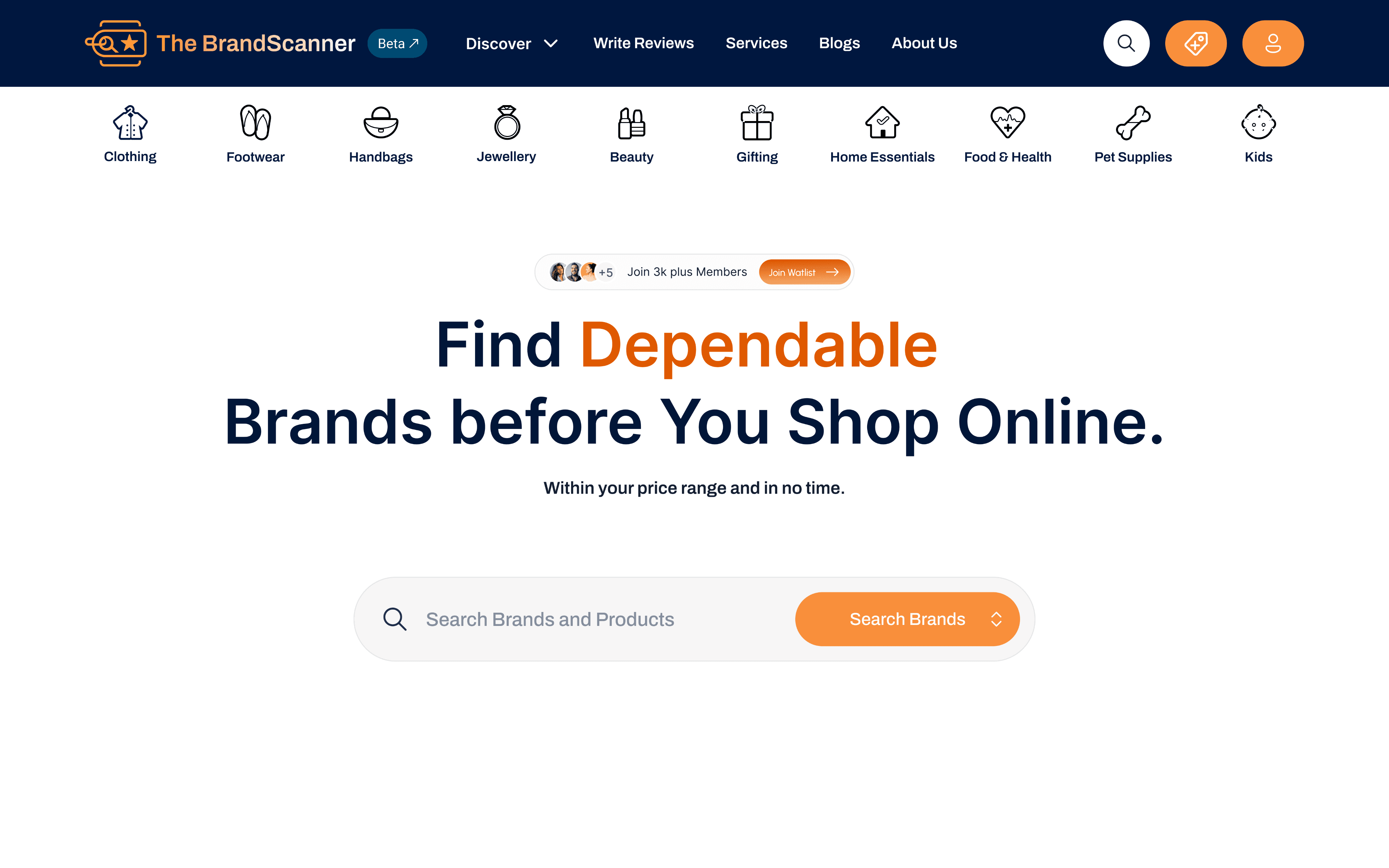 We created a clean, focused homepage with prominent category navigation and a central search function that emphasizes "Find Dependable Brands" rather than products. The design reduces cognitive load while clearly communicating our brand-first value proposition to address the 40% time waste users experienced in discovery.