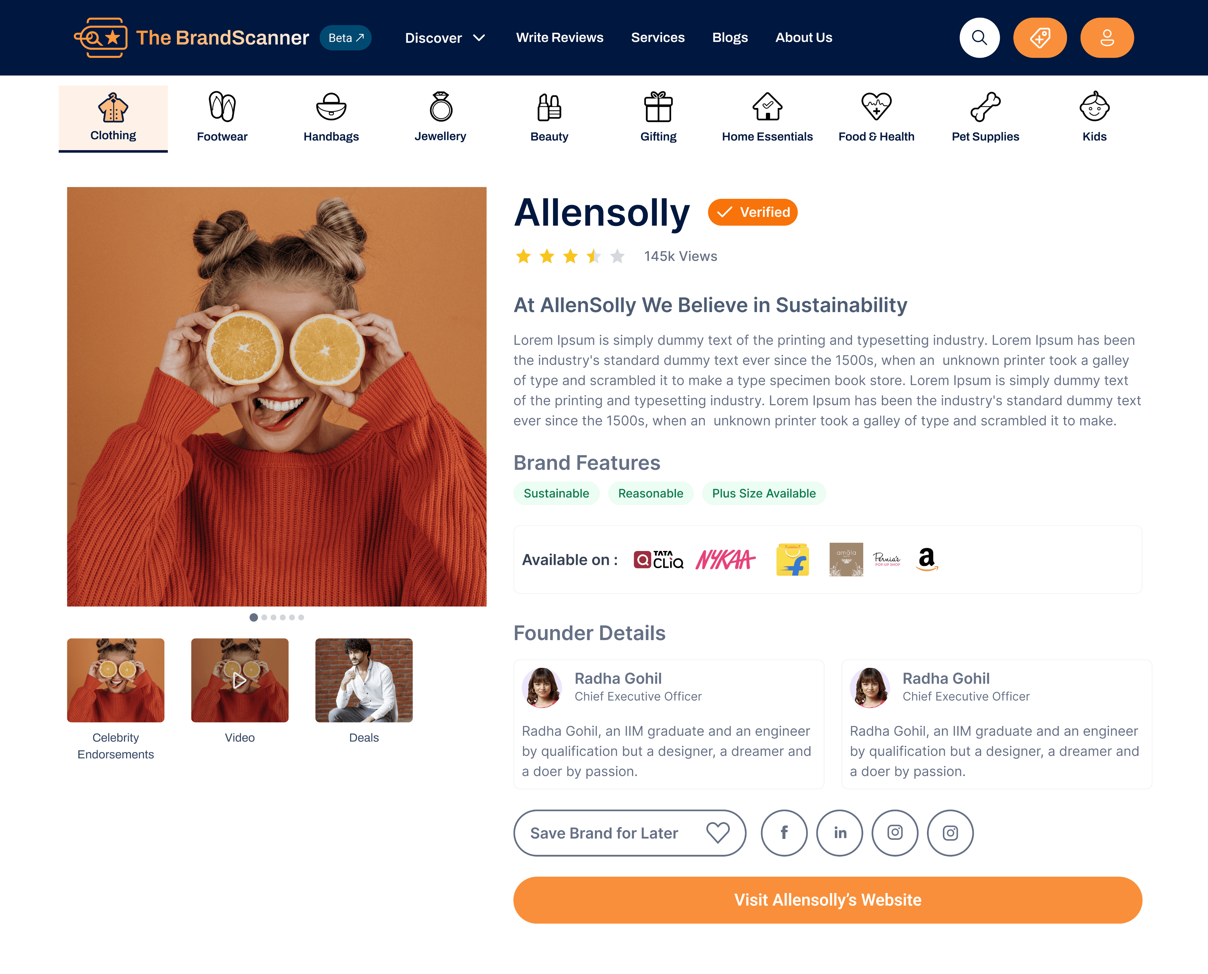 Created an immersive brand page featuring founder stories, brand values, availability across multiple platforms, and clear social proof through ratings and views. The design transforms transactional browsing into meaningful brand connection, directly supporting our philosophy of human-centered discovery while providing the comprehensive information omnichannel shoppers require.